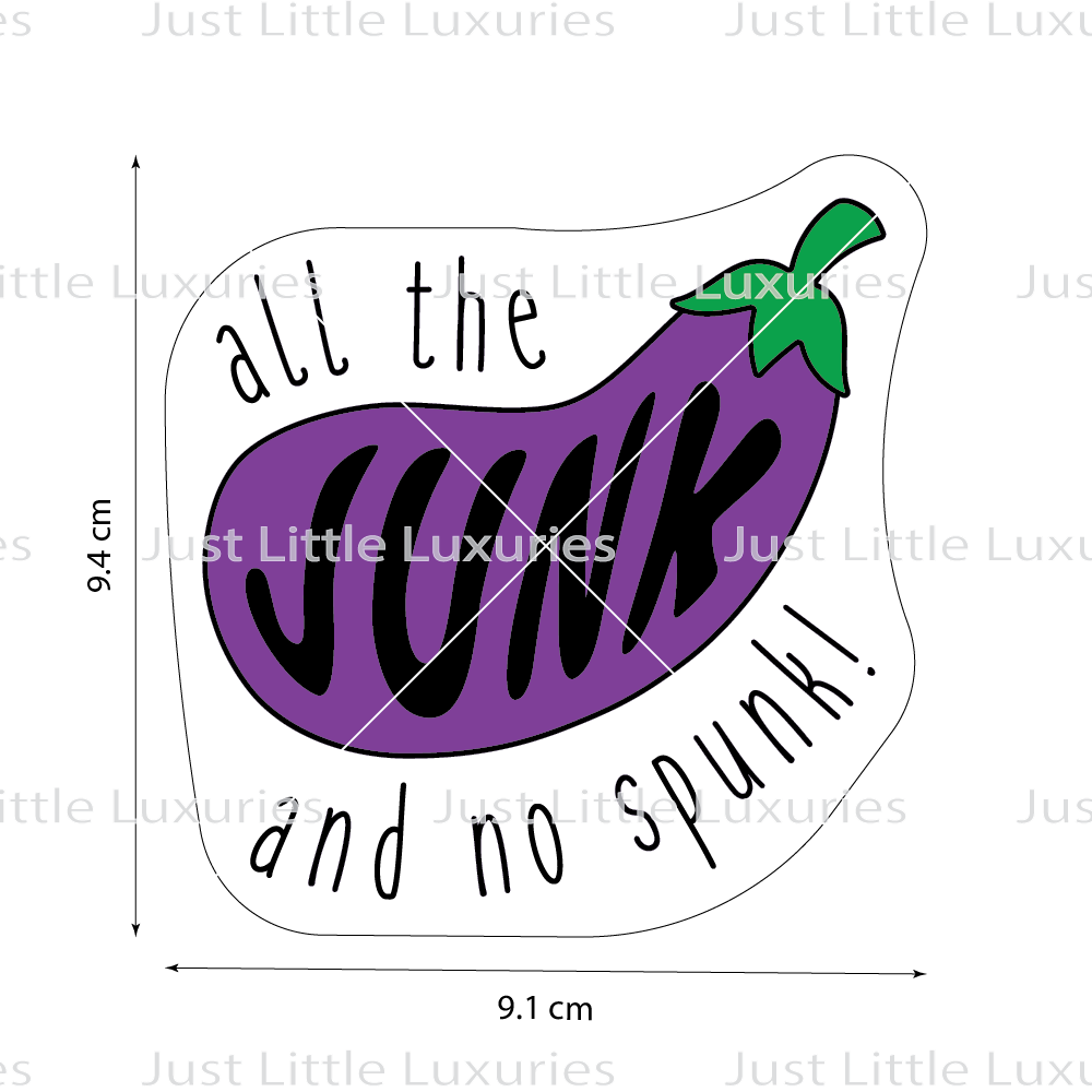 Peel away the layers of traditional baking with our "All the Junk and No Spunk" Cookie Cutter, a standout piece in our Vasectomy Collection. Shaped as a playful eggplant with the saucy slogan, this cutter is ripe for vasectomy celebrations or just as a spirited gag gift.