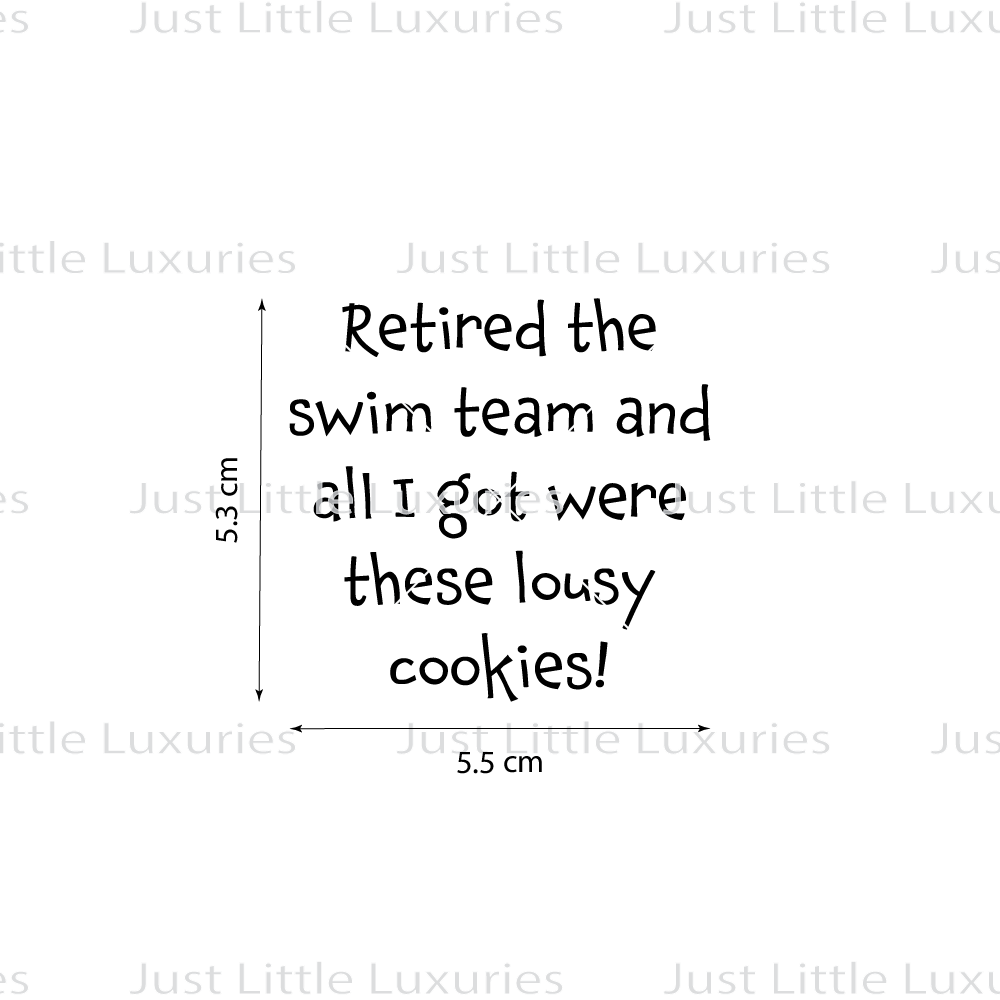 - Witty Message: The playful jest, "Retired the swim team and all I got were these lousy cookies!" brings a chuckle to the table.